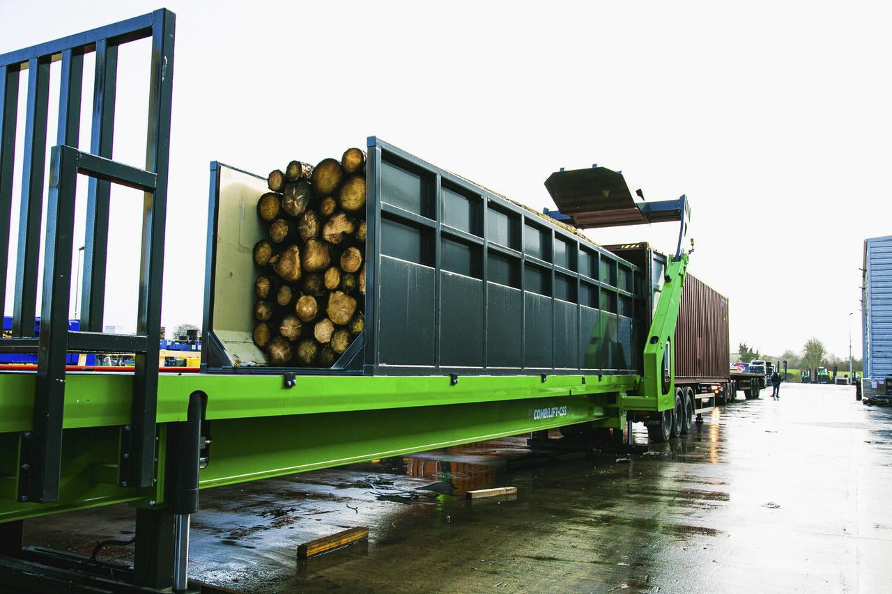 The 30 ton capacity electro-hydraulically powered Combi-CLL offers the same benefits when it comes to speed, safety and product integrity. It was designed to address the requirements of exporters of softwood and hardwood logs, the nature and shape of which make them much trickier to handle than palletised or packed products. Logs can be individually lifted and pre-loaded into a robust, high-sided metal “tub” before the patented push-pull mechanism powers the tub into the container. Once inside, the hydraulic dropdown hatch is closed and locked into position to hold the logs securely in place, and the tub is retracted to allow the logs to settle within the container.